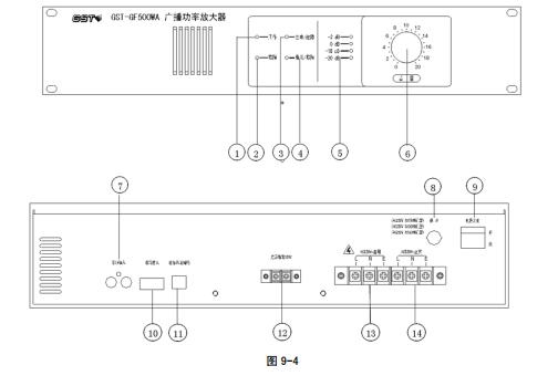 以 GST-GF500WA 型廣播功率放大器為例進行說明,其外形及結(jié)構(gòu)示意圖如圖 9-3。