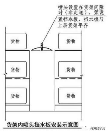 1 設(shè)置貨架內(nèi)置灑水噴頭的倉(cāng)庫(kù),當(dāng)貨架內(nèi)置灑水噴頭上方有孔洞、縫隙時(shí),可在灑水噴頭的上方設(shè)置擋水板;