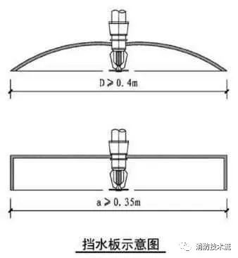 擋水板應(yīng)為正方形或圓形金屬板,其平面面積不宜小于0.12m2,周圍彎邊的下沿宜與灑水噴頭的濺水盤平齊。除下列情況和相關(guān)規(guī)范另有規(guī)定外,其他場(chǎng)所或部位不應(yīng)采用擋水板。