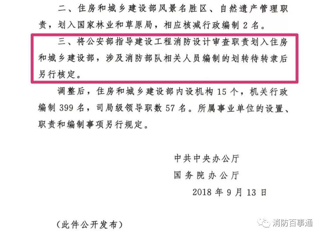 此前中央辦公廳曾正式發(fā)文,將公安部指導(dǎo)建設(shè)工程消防設(shè)計(jì)審查職責(zé)劃入住房和城鄉(xiāng)建設(shè)部,涉及消防部隊(duì)相關(guān)人員編制的劃轉(zhuǎn)待轉(zhuǎn)隸后另行核定。