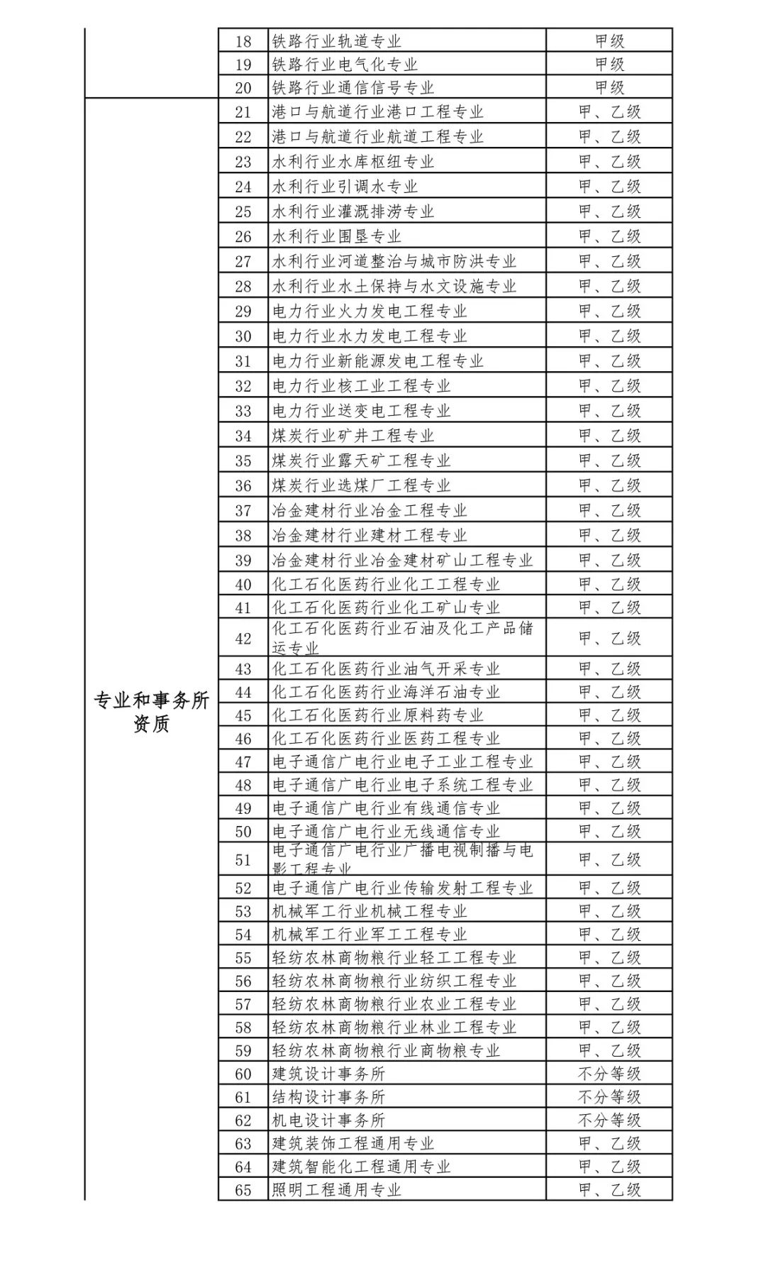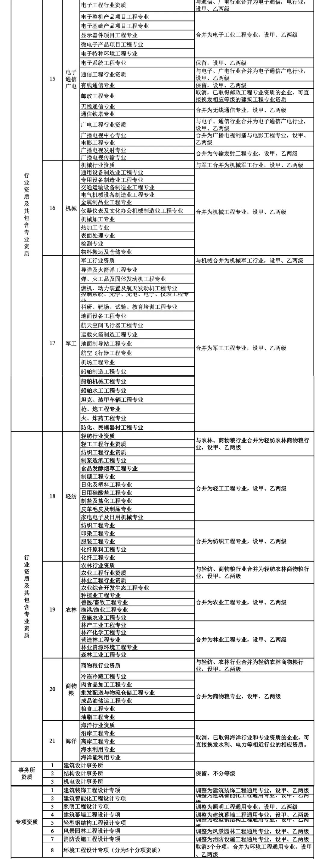 2.工程設(shè)計(jì)資質(zhì)。保留綜合資質(zhì);將21類(lèi)行業(yè)資質(zhì)整合為14類(lèi)行業(yè)資質(zhì);將151類(lèi)專(zhuān)業(yè)資質(zhì)、8類(lèi)專(zhuān)項(xiàng)資質(zhì)、3類(lèi)事務(wù)所資質(zhì)整合為70類(lèi)專(zhuān)業(yè)和事務(wù)所資質(zhì)。綜合資質(zhì)、事務(wù)所資質(zhì)不分等級(jí);行業(yè)資質(zhì)、專(zhuān)業(yè)資質(zhì)等級(jí)原則上壓減為甲、乙兩級(jí)(部分資質(zhì)只設(shè)甲級(jí))。