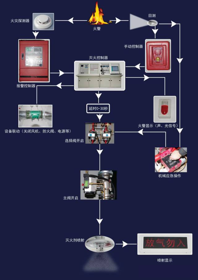 將報警滅火控制器上控制方式選擇鍵撥到“自動”位置時,滅火系統(tǒng)處于自動控制狀態(tài),當防護區(qū)發(fā)生火情,感煙探測器與感溫探測器同時發(fā)出火災信號,報警滅火控制器即發(fā)出聲、光報警信號,同時發(fā)出聯(lián)動指令,關閉聯(lián)鎖設備,經(jīng)過一段延時時間,發(fā)出滅火指令,打開電磁瓶頭閥釋放啟動氣體,啟動氣體通過啟動管道打開相應的選擇閥和瓶頭閥,釋放滅火劑,實施滅火。