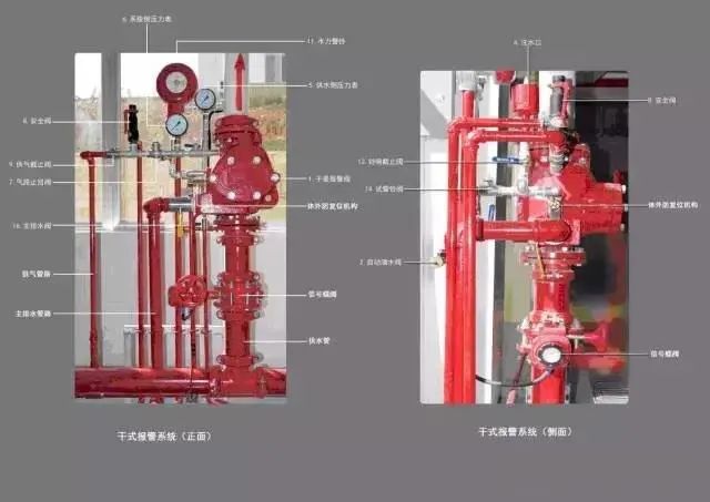保護區(qū)域內發(fā)生火災時,溫度升高使閉式噴頭玻璃球炸裂而使噴頭開啟釋放壓力氣體。這時干式報警閥系統(tǒng)側壓力降低,供水壓力大于系統(tǒng)側壓力(產生壓差),使閥瓣打開(干式報警閥開啟),其中一路壓力水流向灑水噴頭,對保護區(qū)灑水滅火,水流指示器報告起火區(qū)域,另一路壓力水通過延遲器流向水力警鈴,發(fā)出持續(xù)鈴聲報警,報警閥組或穩(wěn)壓泵的壓力開關輸出啟動供水泵信號,完成系統(tǒng)啟動。系統(tǒng)啟動后,由供水泵向開放的噴頭供水,開放噴頭按不低于設計規(guī)定的噴水強度均勻噴水,實施滅火。