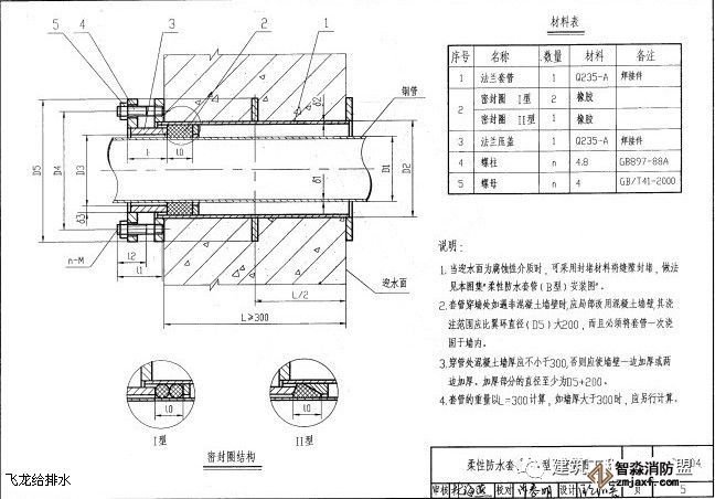4、剛性防水套管適用于管道穿墻處不承受管道振動和伸縮變形的構(建)筑物,對于地震設防要求的地區(qū),如采用剛性防水套管,應在進入池壁或建筑物上墻的管道上就近設置柔性連接,A型適用于鋼管,B、C型適用于球墨鑄鐵管。