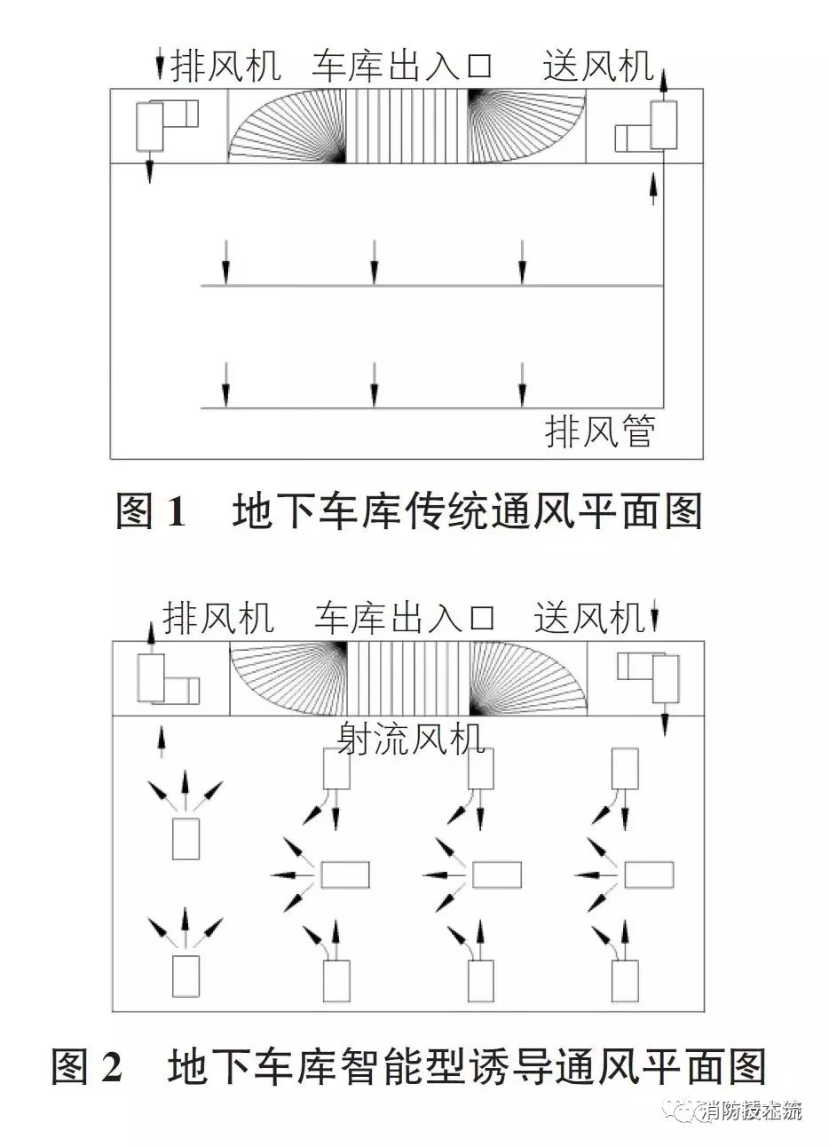 該地下車庫傳統(tǒng)通風(fēng)平面圖及智能型誘導(dǎo)通風(fēng)示意平面圖分別見圖1,圖2。