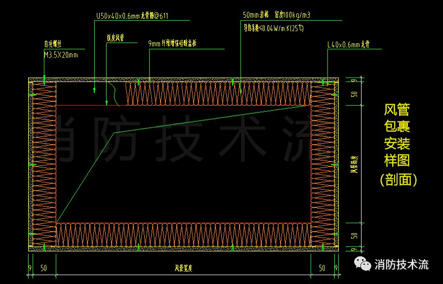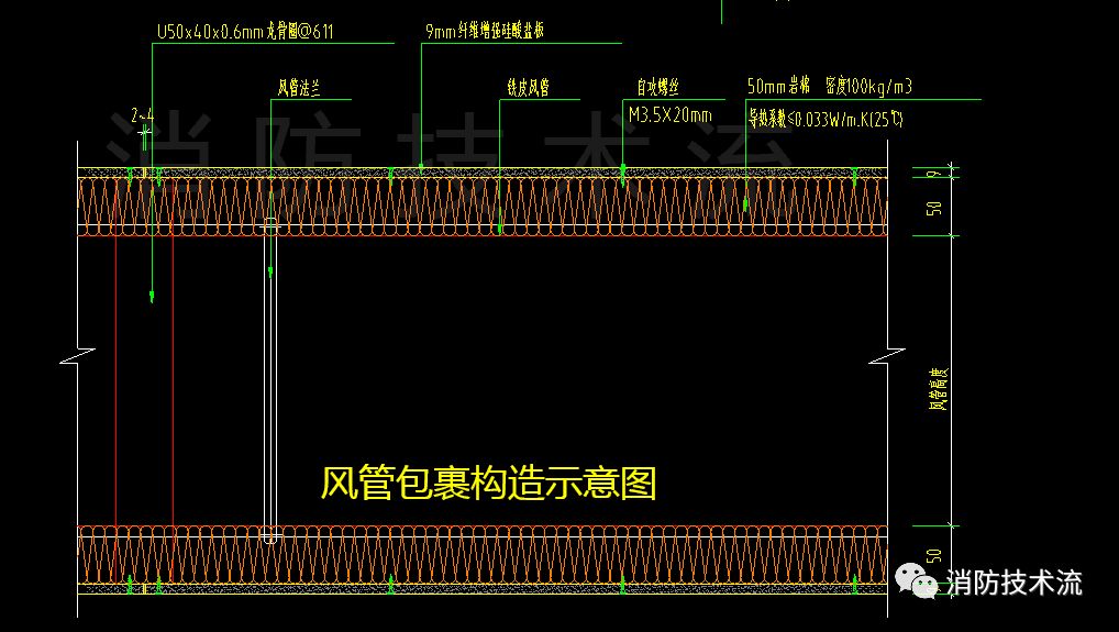 3、耐火極限不小于1h的風(fēng)管(如不在吊頂內(nèi)水平設(shè)置的加壓風(fēng)管、內(nèi)走道及非機(jī)動(dòng)車庫排煙管),外表面作防火包裹處理。包裹材料:9mm纖維增強(qiáng)硅酸鹽防火板+50mm巖棉。