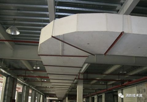 2、耐火極限不小于0.5h的風(fēng)管(如車庫排煙管、消防補(bǔ)風(fēng)風(fēng)管、前室吊頂內(nèi)的加壓風(fēng)管),外表面均勻刷防火漆涂料3遍