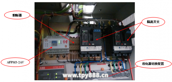 本商場(chǎng)綜合樓項(xiàng)目的AFPM3-2AV三相交流雙電源電壓傳感器安裝于斷路器或隔離開(kāi)關(guān)的輸出端和雙電源切換裝置的輸入端之間,主電源電壓信號(hào)接1,2,3,4這四個(gè)端子,備用電源電壓信號(hào)接5,6,7,8這四個(gè)端子,以位于地下室區(qū)域的消火栓泵配電箱雙電壓監(jiān)控為例,傳感器AFPM3-2AV安裝位置示意圖如圖2所示,實(shí)物安裝位置圖如圖3所示,電壓信號(hào)接線示意圖如圖4所示。