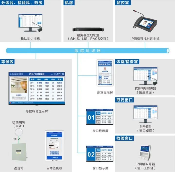 系統(tǒng)采用6類網(wǎng)線,網(wǎng)絡(luò)式架構(gòu);候診區(qū)設(shè)置IPTV電視及復(fù)診自助簽到機(jī);每診室設(shè)置1臺顯示屏;門診樓設(shè)置LED大屏、LED條屏;急診、出入院辦理、收費(fèi)窗口、取藥處、采血處設(shè)置窗口顯示屏。