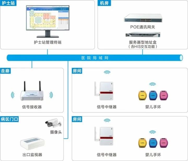 嬰兒防盜系統(tǒng)連接醫(yī)院外網(wǎng),設(shè)置于住院樓3層產(chǎn)科區(qū)病房、4層VIP科區(qū)病房+一體化家患產(chǎn)房、5層月子房;實(shí)時定位嬰兒位置、可形成運(yùn)動軌跡圖,家屬可通過APP查看。