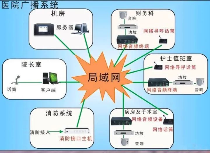 系統(tǒng)采用網(wǎng)絡(luò)式架構(gòu)并與消防系統(tǒng)聯(lián)動;控制優(yōu)先級緊急廣播、語音廣播、背景音樂廣播;護(hù)士站設(shè)置尋呼話筒和音量調(diào)節(jié)設(shè)備。