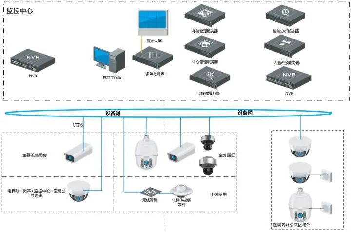 系統(tǒng)采用超五類網(wǎng)線,網(wǎng)絡(luò)式架構(gòu);醫(yī)院各出入口、候診區(qū)、內(nèi)部公共走廊采用人臉識別攝像機(jī);院區(qū)出入口、內(nèi)部公區(qū)采用人臉識別攝像機(jī);在南、北樓之間設(shè)置全景攝像機(jī),立體監(jiān)視;搶救室、護(hù)士站、ICU、手術(shù)室等特殊區(qū)域位置監(jiān)控圖像單獨(dú)存儲,可根據(jù)需求單獨(dú)管理。