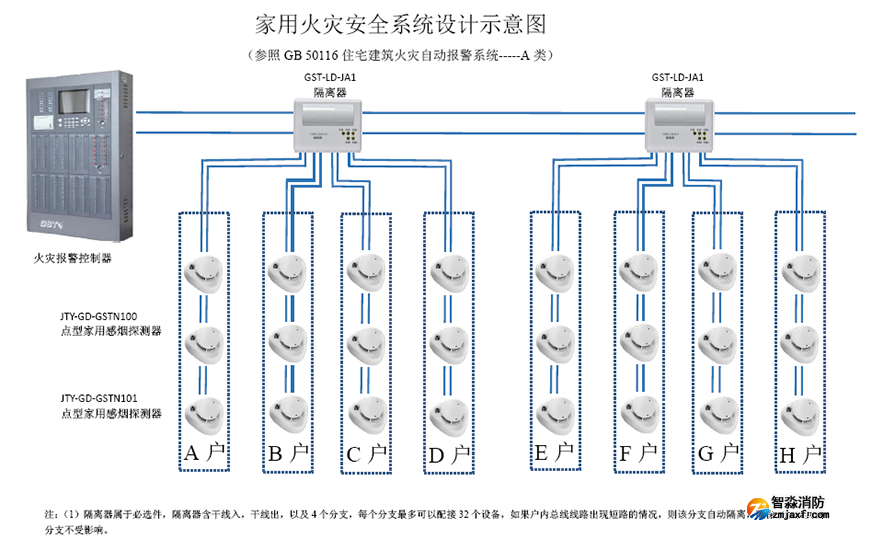 GST家用火災(zāi)安全系統(tǒng)B類設(shè)計(jì)中,隔離器為可選件,不占地址,家用火災(zāi)報(bào)警控制器和專用電源箱、家用探測(cè)器均占地址點(diǎn)。