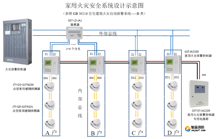 GB50016-2014《建筑設(shè)計(jì)防火規(guī)范》自2015年5月1日起實(shí)施,明確>54M住宅宜套內(nèi)安裝探測(cè)報(bào)警,>100MM住宅應(yīng)安裝探測(cè)報(bào)警。GST家用火災(zāi)安全系統(tǒng)為滿足該標(biāo)準(zhǔn)對(duì)住宅消防報(bào)警要求而設(shè)計(jì)。GST家用火災(zāi)安全系統(tǒng)中家用火災(zāi)報(bào)警控制器由GST-DY-JA2200家用火災(zāi)報(bào)警控制器專用電源箱提供DC24V電源,采用用內(nèi)部總線與家用火災(zāi)探測(cè)器通訊,接收探測(cè)器上傳的火警和故障信息。能夠預(yù)存兩組用戶電話號(hào)碼,當(dāng)家用火災(zāi)報(bào)警控制器收到探測(cè)器上傳的火警信息后,立即發(fā)出聲光報(bào)警信號(hào)并顯示相應(yīng)火警信息,同時(shí)自動(dòng)撥打預(yù)存號(hào)碼,并發(fā)出語音或短信報(bào)警。配接了火災(zāi)報(bào)警控制器,還能夠通過外部總總線及時(shí)上傳火警或故障報(bào)警信息。