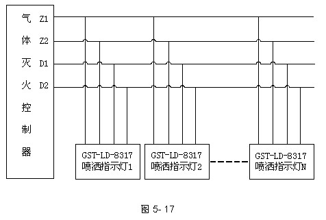 噴灑燈與氣體滅火控制器的總線和電源DC24V相連,實現(xiàn)噴灑噴灑功能。具體連接方法如圖5-17所示。