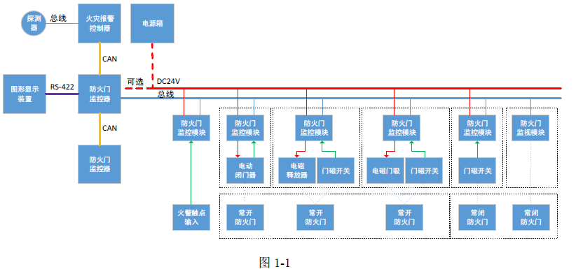 防火門監(jiān)控系統(tǒng)屬于火災(zāi)自動(dòng)報(bào)警及消防聯(lián)動(dòng)控制系統(tǒng)的重要組成部分。日常運(yùn)行時(shí),該系統(tǒng)用于監(jiān)測(cè)各防火門的開、閉狀態(tài),當(dāng)防火門處于非正常的打開或非正常的關(guān)閉狀態(tài)時(shí)產(chǎn)生門故障報(bào)警信號(hào);發(fā)生火災(zāi)時(shí),該系統(tǒng)用于遠(yuǎn)程控制(手動(dòng)或自動(dòng))常開防火門的關(guān)閉,阻止火勢(shì)、煙氣向外蔓延,接收并顯示防火門關(guān)閉的反饋信號(hào)。
