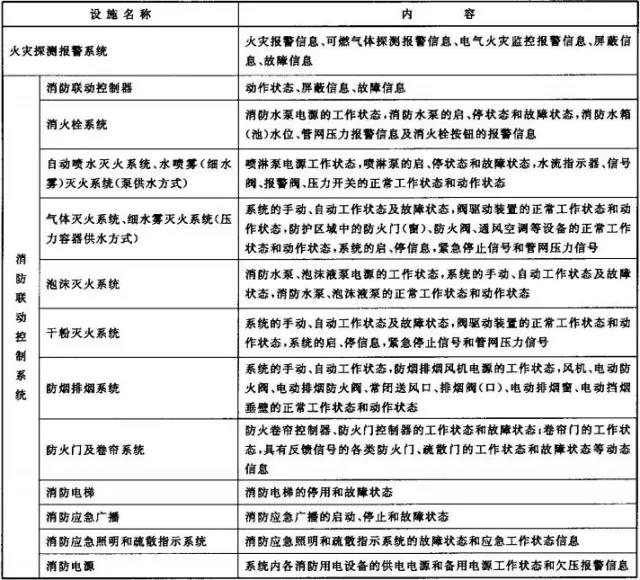 2、消防控制室內(nèi)設(shè)置的消防設(shè)備應(yīng)能監(jiān)控并顯示建筑消防設(shè)施運(yùn)行狀態(tài)信息,并應(yīng)具有向城市消防遠(yuǎn)程監(jiān)控中心(以下簡稱監(jiān)控中心)傳輸這些信息的功能。建筑消防設(shè)施運(yùn)行狀態(tài)信息見下表1。