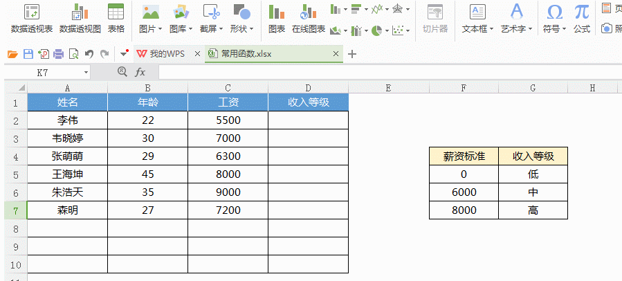 模糊查找:將員工收入劃分等級,工資低于6000屬低收入,6000-8000中等收入,8000以上高收入。