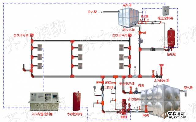自動噴水滅火系統(tǒng)分為濕式、干式和預(yù)作用式等類型。目前,大部分高層建筑使用的為濕式系統(tǒng),即平時在管道中充有一定壓力的水,當保護對象發(fā)生火災(zāi)時,噴頭周圍溫度升高,達到一定溫度時,含金片熔化,噴頭碎裂,水從噴口向四周均勻噴灑,進行滅火。其組成是由報警閥、延遲器、水力警鈴、管網(wǎng)、噴頭。