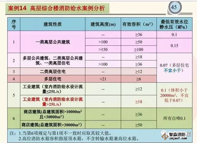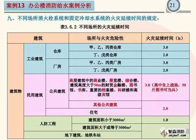7、消防水池容積計(jì)算舉例:某辦公樓,建筑高度為32m,室外消火栓的設(shè)計(jì)流量為25L/s,室內(nèi)消火栓的設(shè)計(jì)流量為20L/s,自動(dòng)噴水滅火系統(tǒng)的設(shè)計(jì)流量為20L/s。市政給水管網(wǎng)能夠保證室外消防用水量,求該建筑消防水池最小有效容積。解析:市政給水管網(wǎng)能夠保證室外消防用水量的要求,故消防水池可不儲(chǔ)存室外消火栓系統(tǒng)的用水量,消防水池的最小有效容積=室內(nèi)消火栓+自動(dòng)噴水滅火系統(tǒng)。建筑為辦公樓,高度為32m,根據(jù)《消規(guī)》3.6.2,消火栓系統(tǒng)的火災(zāi)延續(xù)時(shí)間為2h,室內(nèi)消火栓系統(tǒng)的用水量為:20×2×3.6=144m³;自動(dòng)噴水滅火系統(tǒng)的火災(zāi)延續(xù)時(shí)間一般為1h,自動(dòng)噴水滅火系統(tǒng)的用水量為:20×1×3.6=72m³;消防水池的最小有效容積為144+72=216m³。