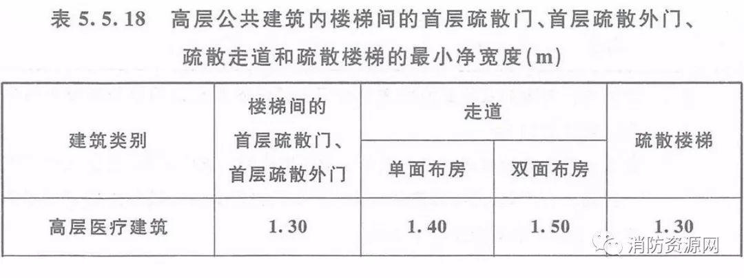 2、高層醫(yī)療建筑內(nèi)樓梯間的首層疏散門、首層疏散外門、疏散走道和疏散樓梯的最小凈寬度(m),尚應(yīng)符合《建規(guī)》表5.5.18的規(guī)定。