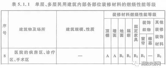 一、單層、多層醫(yī)院建筑的病房區(qū)、診療區(qū)、手術(shù)區(qū),內(nèi)部各部位裝修材料的燃燒性能等級(jí),不應(yīng)低于《建筑內(nèi)部裝修設(shè)計(jì)防火規(guī)范》表5.1.1的規(guī)定。
