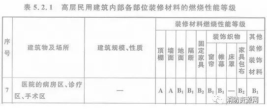 二、高層醫(yī)院建筑的病房區(qū)、診療區(qū)、手術(shù)區(qū),內(nèi)部各部位裝修材料的燃燒性能等級(jí),不應(yīng)低于《建筑內(nèi)部裝修設(shè)計(jì)防火規(guī)范》表5.2.1的規(guī)定。
