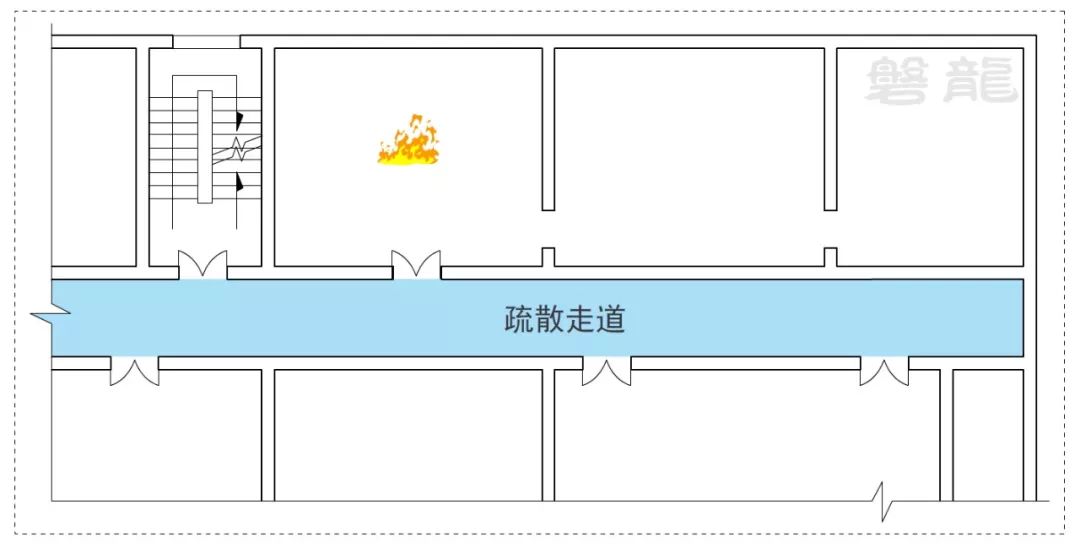 1、室內房間屬于危險區(qū)域,一旦發(fā)生火災,人員應迅速疏散至相對安全的次危險區(qū)域(疏散走道),通過疏散走道疏散至安全出口(圖示1)。