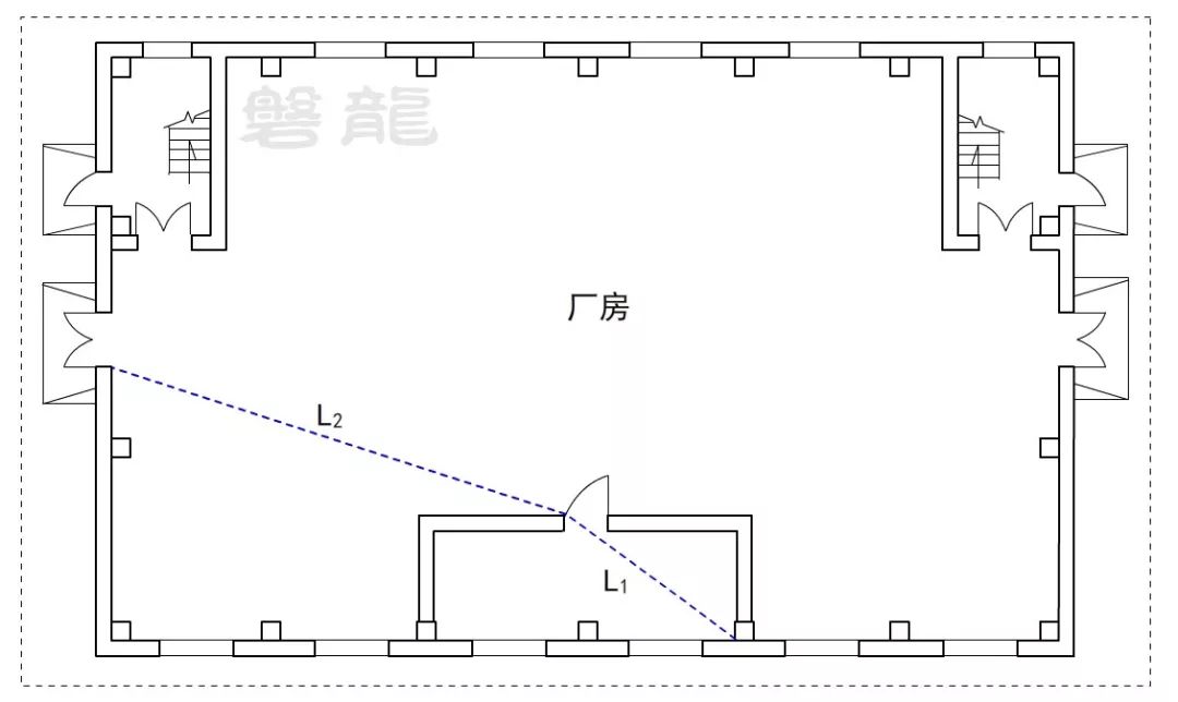 2、廠房倉庫同樣不應采用嵌套(穿套)設置的方式,確因功能需要,嵌套(穿套)設置的房間不應超過一級,疏散距離應按人員行走的直線距離計算,在圖示6的廠房中,示例房間內任一點至安全出口的直線距離,應為L1+L2。