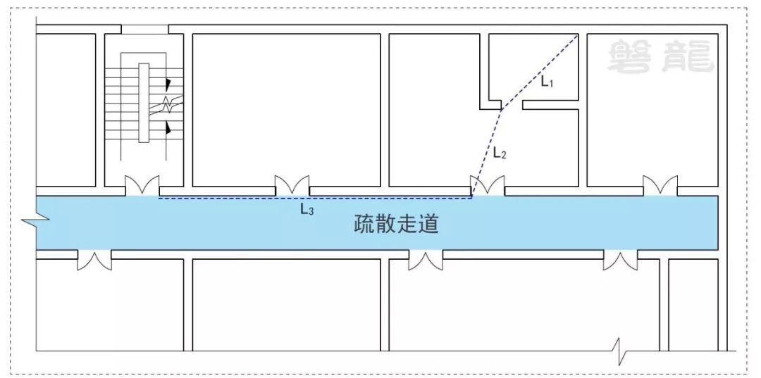 3、確因功能需要,嵌套(穿套)設置的房間不應超過一級,疏散距離應按人員行走的直線距離計算,在圖示4的公共建筑中,示例房間內任一點至房間直通疏散走道的疏散門的直線距離,應為L1+L2。