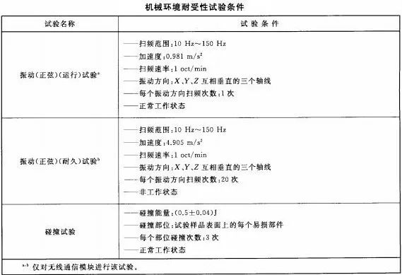 系統(tǒng)應(yīng)能耐受下表所規(guī)定的機(jī)械條件下的各項(xiàng)試驗(yàn)。試驗(yàn)期間,系統(tǒng)應(yīng)無(wú)機(jī)械損傷和緊固部位松動(dòng)現(xiàn)象;試驗(yàn)后,系統(tǒng)應(yīng)保持正常無(wú)線通信狀態(tài)。