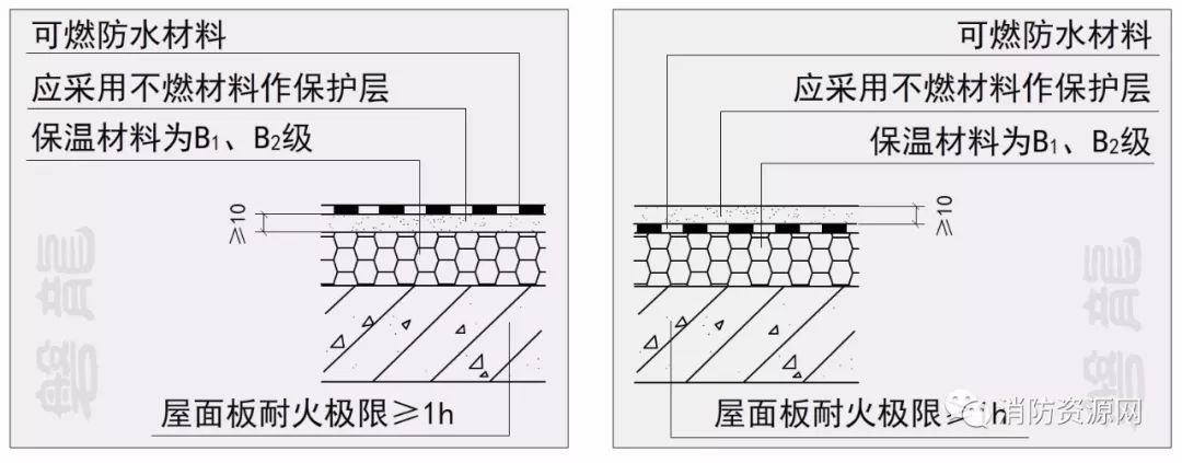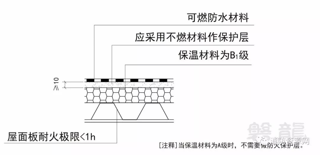 一、建筑的屋面外保溫系統(tǒng),當(dāng)屋面板的耐火極限不低于1.00h時,保溫材料的燃燒性能不應(yīng)低于B2級;當(dāng)屋面板的耐火極限低于1.00h時,不應(yīng)低于B1級。采用B1、B2級保溫材料的外保溫系統(tǒng)應(yīng)采用不燃材料作防護(hù)層,防護(hù)層的厚度不應(yīng)小于10mm。