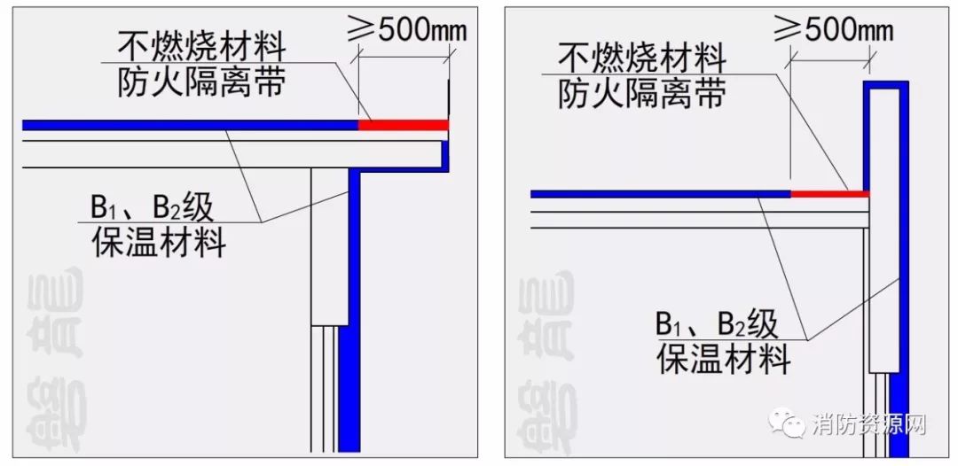 三、建筑的屋面和外墻外保溫系統(tǒng)均采用B1、B2級保溫材料時,屋面與外墻之間應(yīng)采用寬度不小于500mm的不燃材料設(shè)置防火隔離帶進(jìn)行分隔。