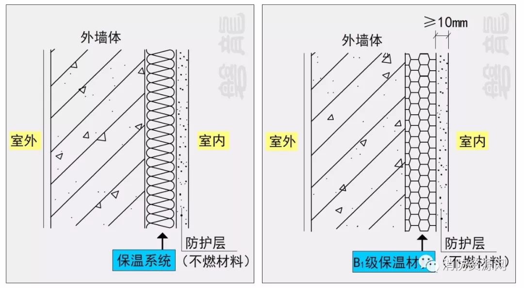 2.1、建筑外墻的內(nèi)保溫系統(tǒng),保溫材料設(shè)置在建筑外墻的室內(nèi)側(cè),保溫系統(tǒng)應(yīng)采用不燃材料做防護(hù)層。當(dāng)采用燃燒性能為B1級的保溫材料時,防護(hù)層的厚度不應(yīng)小于10mm。