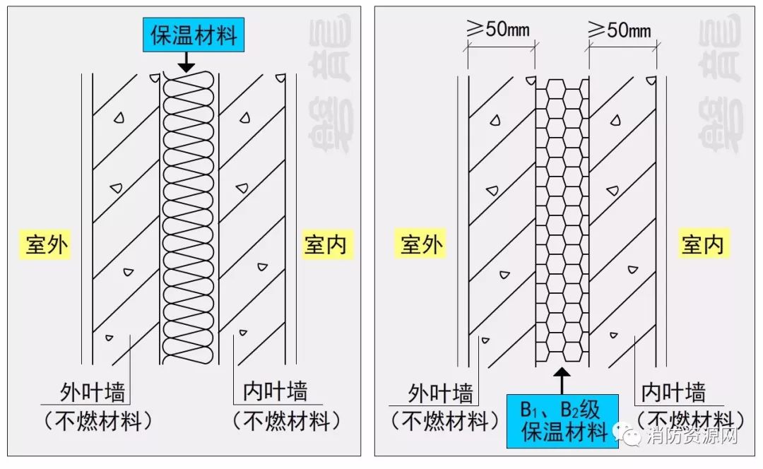 當(dāng)保溫材料的燃燒性能為B1B2級時,保溫材料兩側(cè)的不燃材料墻體厚度均不應(yīng)小于50mm