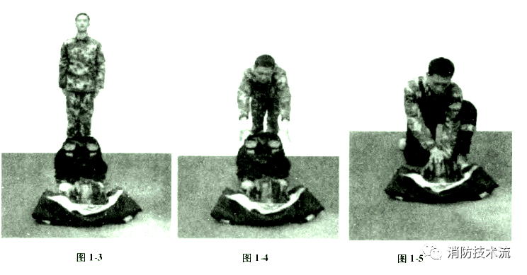 服裝擺放方法:插環(huán)式安全帶(附安全扣)折成雙疊,橫放在地面上;滅火防護服上裝正疊,尼龍搭扣對齊展平,沿兩側(cè)向背后折起,攔腰折成兩疊,衣領(lǐng)翻向兩側(cè),衣袖縮入肩部成圓筒狀,平放在安全帶上,消防頭盔平放,帽徽朝前,帽釘朝上;下裝套在消防員滅火防護靴上,放于上裝后面,靴跟與器材線對齊。