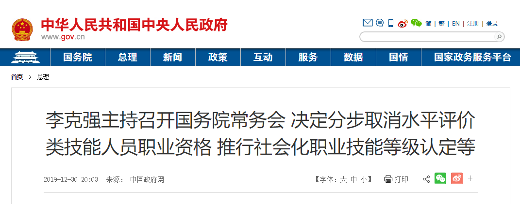 國務(wù)院總理李克強(qiáng)12月30日主持召開國務(wù)院常務(wù)會(huì)議,決定分步取消水平評(píng)價(jià)類技能人員職業(yè)資格,推行社會(huì)化職業(yè)技能等級(jí)認(rèn)定。