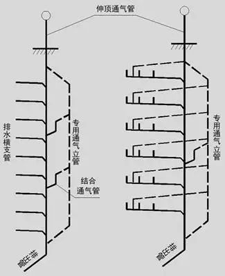 當建筑物層數(shù)和衛(wèi)生器具較多時,因排水量大,空氣流動過程宜受排水過程干擾,須將排水管和通氣管分開,設專用通氣管道。