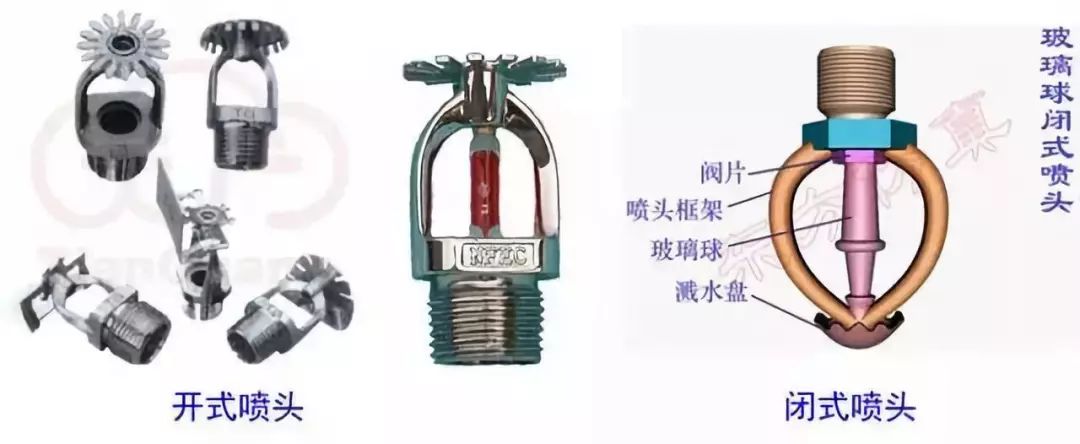 閉式(噴頭噴口由熱敏元件組成,達到一定溫度后自動開啟,如玻璃球爆炸、易熔合金脫離。)