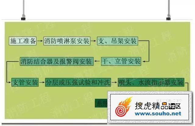 對于自動噴水滅火系統(tǒng)的施工過程,監(jiān)理應嚴格要求按以下工藝流程進行: