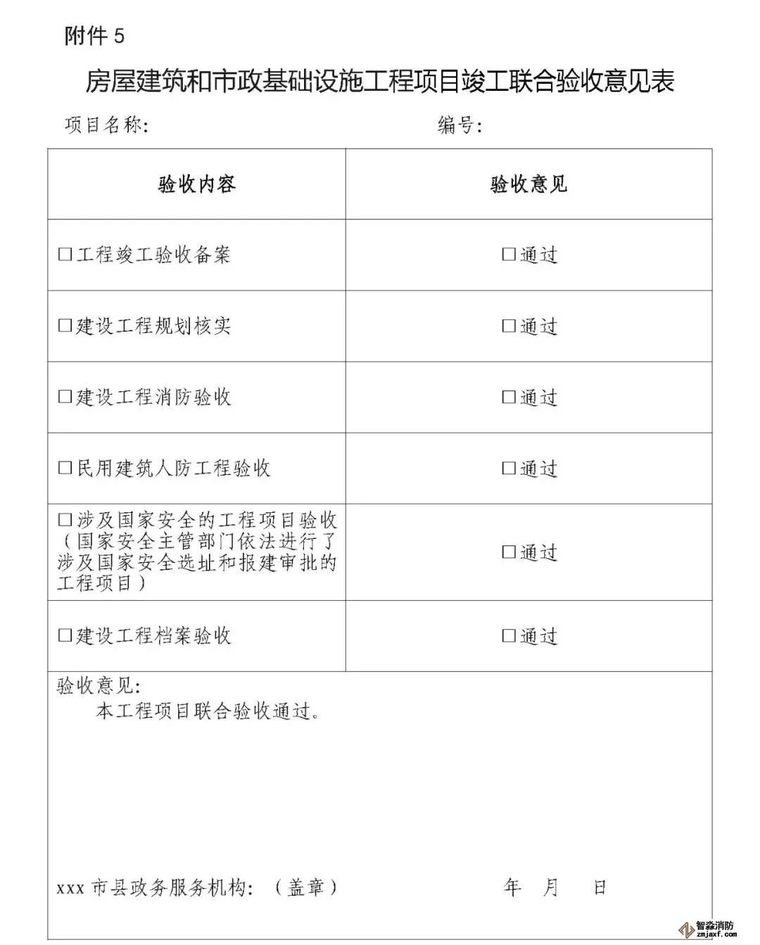 第十三條  各驗(yàn)收主管部門要按照工程項(xiàng)目驗(yàn)收情況,填寫《房屋建筑和市政基礎(chǔ)設(shè)施工程項(xiàng)目專項(xiàng)驗(yàn)收意見表》(以下簡稱《專項(xiàng)驗(yàn)收意見表》,見附件4),出具專項(xiàng)驗(yàn)收通過或不通過需要整改的意見,并送至綜合窗口;對專項(xiàng)驗(yàn)收不通過的工程項(xiàng)目,由綜合窗口統(tǒng)一匯總,一次性將整改意見反饋建設(shè)單位,整改時(shí)間不計(jì)入聯(lián)合驗(yàn)收時(shí)間。