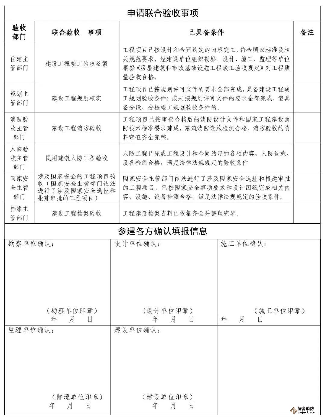 建設(shè)工程規(guī)劃核實(shí)、建設(shè)工程消防驗(yàn)收、民用建筑人防工程驗(yàn)收、涉及國家安全項(xiàng)目驗(yàn)收(國家安全主管部門依法進(jìn)行了涉及國家安全選址和報(bào)建審批的工程項(xiàng)目)、建設(shè)工程檔案等驗(yàn)收事項(xiàng)和工程竣工驗(yàn)收備案實(shí)行限時(shí)聯(lián)合驗(yàn)收,統(tǒng)一出具聯(lián)合驗(yàn)收意見。對于驗(yàn)收涉及的測繪工作,實(shí)行“一次委托、聯(lián)合測繪、成果共享。    其他驗(yàn)收事項(xiàng)納入相關(guān)階段辦理或與相關(guān)階段并行推進(jìn),須在聯(lián)合驗(yàn)收前由建設(shè)單位主動(dòng)聯(lián)系相關(guān)部門和單位完成驗(yàn)收,地震安全性評價(jià)在工程設(shè)計(jì)前完成,環(huán)境影響評價(jià)、節(jié)能評價(jià)等評估評價(jià)和取水許可等事項(xiàng)在開工前完成,供水、供電、燃?xì)狻⑴潘?、通信等市政公用基礎(chǔ)設(shè)施報(bào)裝提前到開工前辦理,在工程施工階段完成相關(guān)設(shè)施建設(shè),竣工驗(yàn)收后直接辦理接入事宜。