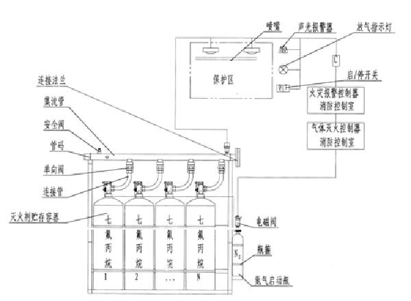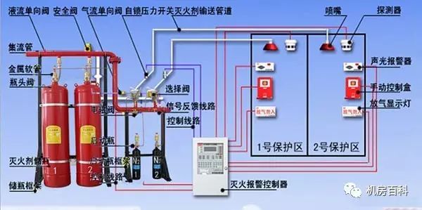 系統(tǒng)主要組件有:儲氣鋼瓶、容器閥、單向閥、選擇閥、驅(qū)動裝置、集流管、金屬軟管、噴嘴、壓力反饋裝置、控制盤、系統(tǒng)的管路附件、滅火劑輸送管路附件和儲氣瓶支架等