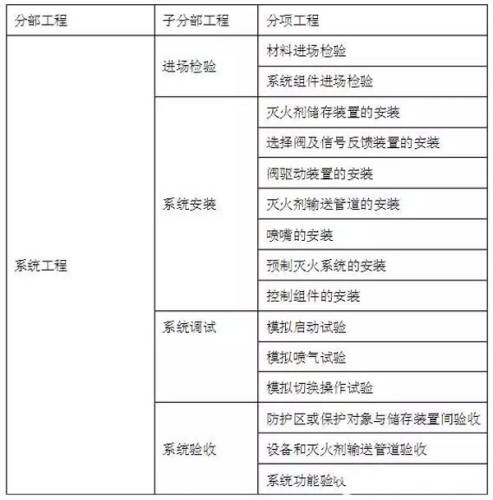 氣體滅火系統(tǒng)的分部工程、了分部工程、分項(xiàng)工程劃分可按下本規(guī)范表執(zhí)行